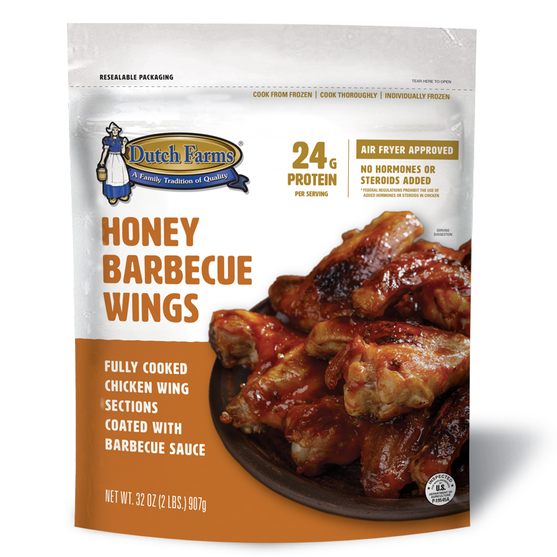 CHICKEN 1ST AND 2ND WING SECTIONS, WATER, SALT, SODIUM PHOSPHATE. COATED WITH: HIGH FRUCTOSE CORN SYRUP, TOMATO PASTE, DISTILLED VINEGAR, CORN SYRUP, HONEY, WATER, MOLASSES, SALT, MUSTARD BRAN, NATURAL FLAVOR (INCLUDING HICORY SMOKE), SUGAR, SPICES, ONION POWDER, GARLIC POWDER, CELERY SEED & SODIUM BENZOATE (AS A PRESERVATIVE).